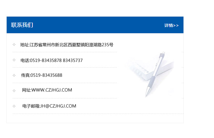 地址:常州市新北區(qū)友邦商務(wù)大廈1幢16、17層  電話:0519-85101652  傳真:0519-85112595  郵編:213022  網(wǎng)址:www.cz-jiayue_cn.xinyuanmei.com  郵箱:xiajifengaa@163.com